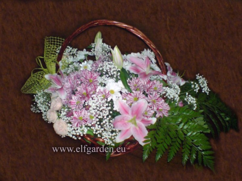 Свежи цветя -комбинация от ароматен лилиум, мини рози, хризантеми, нежна гипсофила и много зеленина, аранжирани в кошница.