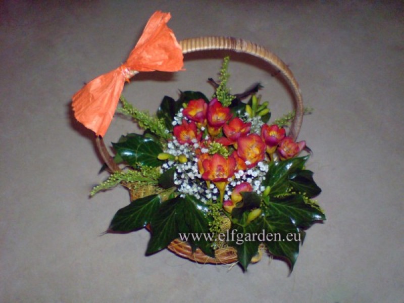 Свежи цветя - фрезии, нежна гипсофила, солидаго и зеленина, аранжирани в кошница.