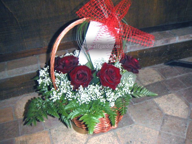 Свежи цветя - 5 червени рози, нежна гипсофила и много зеленина, аранжирани в кошница.
