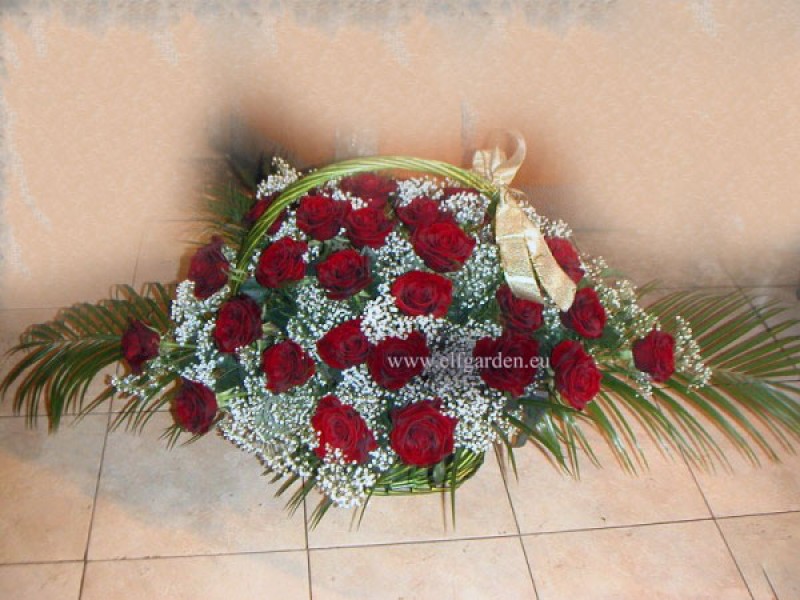 Свежи цветя - 35 червени рози, нежна гипсофила и много зеленина, аранжирани в кошница.