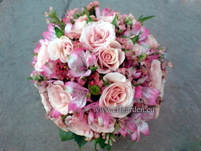 Кръгъл сватбен букет от мини рози,алстромерия, статице и зеленина, аранжирани на микрофон.